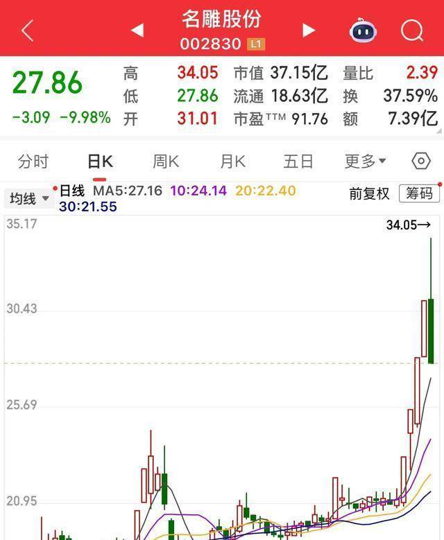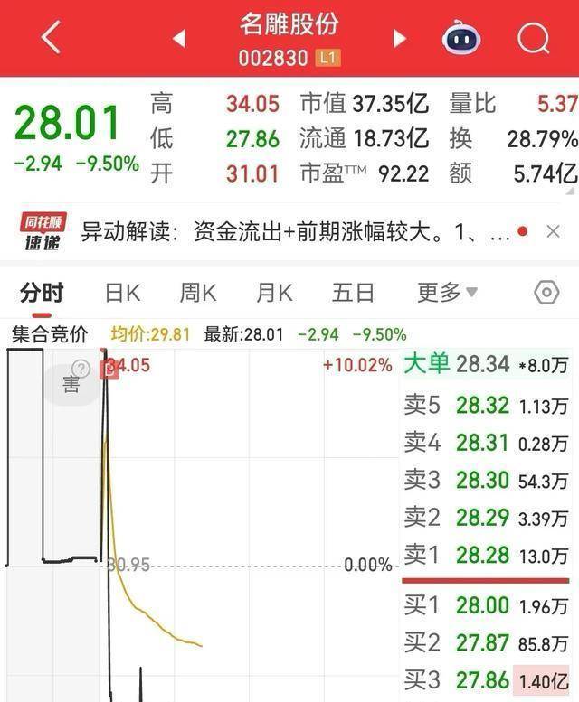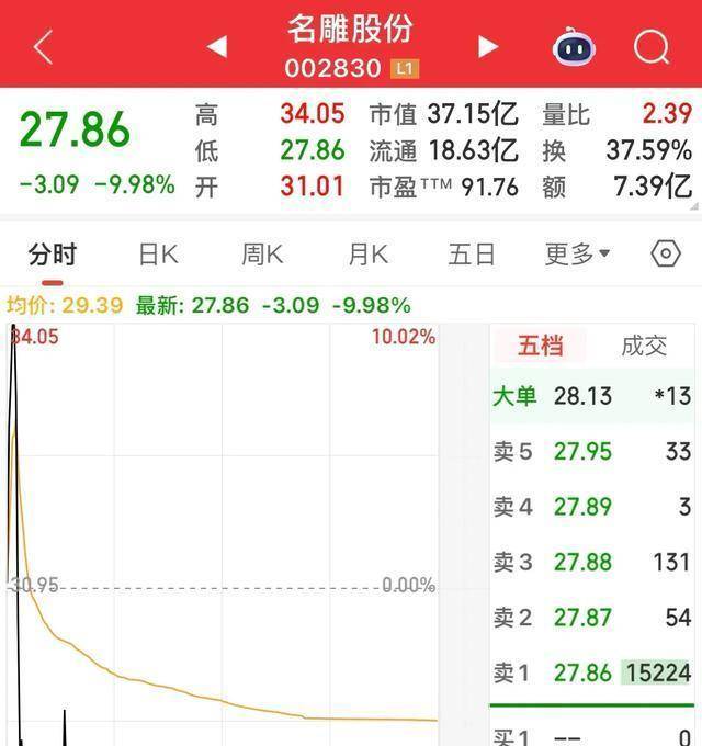 事情很简单也很讽刺,名雕股份在此前连续四个换手涨停之后,盘中小幅高开迅速封涨停,本应是英雄落幕的场景,却在涨停板上没待一分钟便被撞开,接着直线下砸到跌停,来回不到五分钟,打板进去的人瞬间亏掉“20个点”,想哭无门,因为新进的票要到次日才能卖出,市场给出的答案是热情可以来得快,也可以被慢慢榨干。