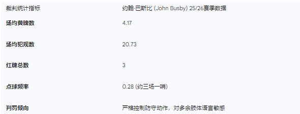 本场比赛的执法主裁判为约翰·巴斯比(John Busby)。巴斯比的执法风格在英冠裁判圈内以“严苛”著称。在2025/26赛季的12场英冠比赛中,他共出示了50张黄牌和3张红牌,场均出牌数高达 4.41 张,这一数据显著高于联赛平均水平 。