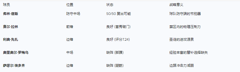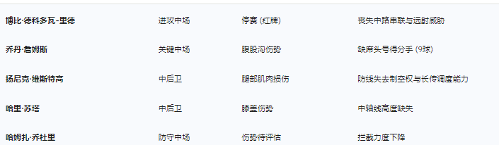 莱切斯特城的阵容完整度目前正处于赛季最低谷。多名主力球员的长期缺阵使临时主帅安迪·金不得不频繁使用U21球员来填补大名单,这在英冠这种高对抗强度的联赛中极具风险 。