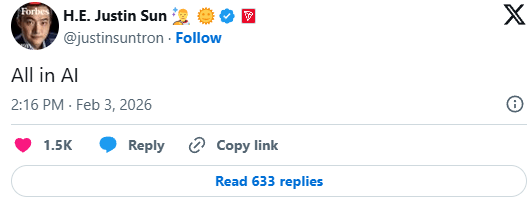 即便如此,孙宇晨依然对人工智能与区块链的融合前景保持乐观,他认为二者的深度协同是行业最具潜力的长期发展方向之一,而这一潜力的释放,关键在于开发者能够推出兼具实用性与落地性的工具,摆脱单纯的实验性探索,让技术真正服务于实际需求。为践行这一理念,孙宇晨近期已推出将“All in AI”的规划逐步落地,推动技术探索从概念走向实践。